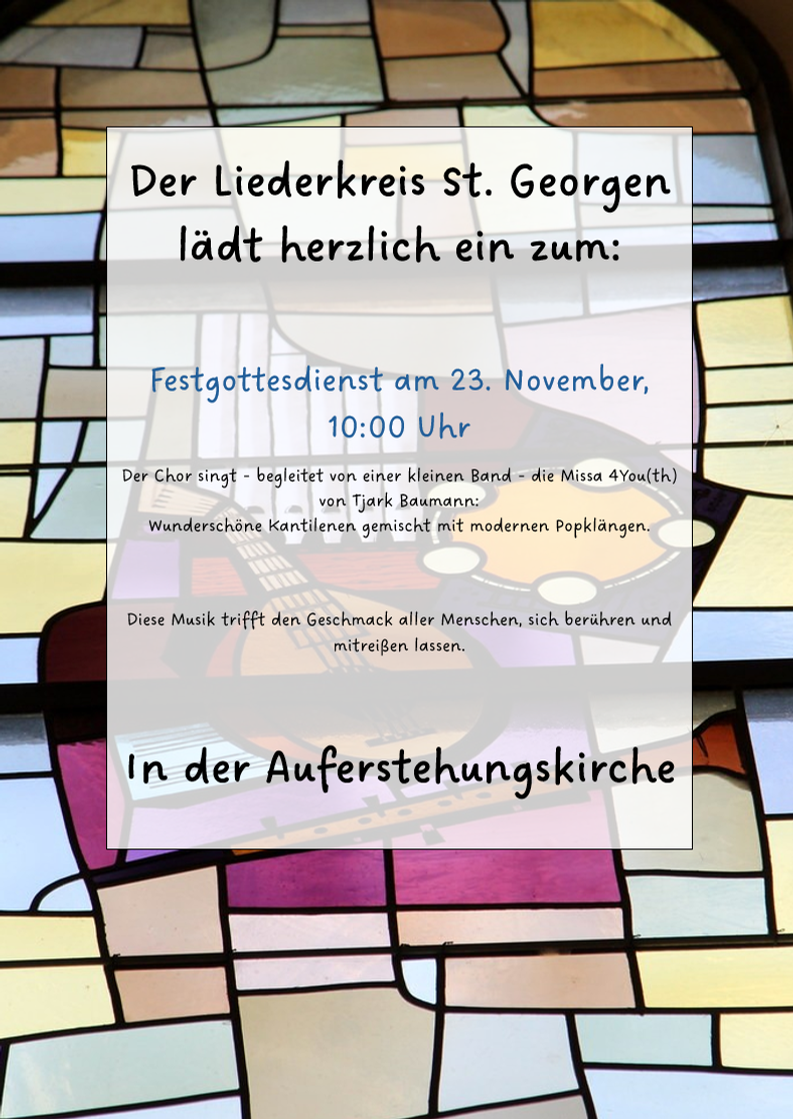 Als Chor der Pfarre St. Georgen gestalten wir die Musik der großen Festmessen in der Auferstehungskirche. Wir proben für jeden Festtag ein spezielles Programm. Ganz vieles ist neu, manches aus unserem Repertoire zum Wiederhören. Lassen Sie sich überraschen und mitreißen.